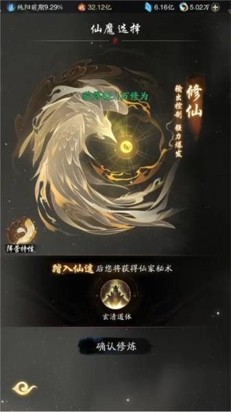 境界达纯阳境界的道友,可以在“修炼”界面点击【仙魔】图标,即可选择修仙或堕魔之路。选择之后想要更换,可在灵界开启14天后进行转修,后期资源丰富的道友还可以选择仙魔双修,成就无上神通。