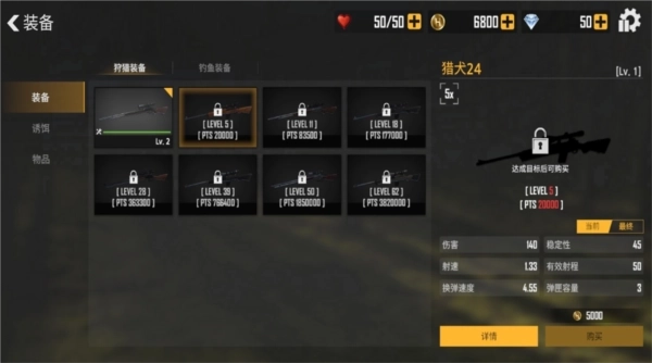 2、点击枪械可以看到我们需要升级到五级,拥有5000金币的时候就可以直接购买了。