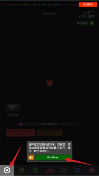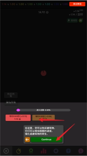 2、在这里,您可以购买建筑物。它们可以增加圆圈的速度。强化是建筑物的转生。
