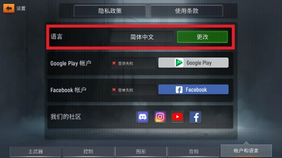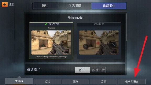 2、进入设置界面,点击右下角的账户和语言,同时,在设置中玩家可以自由设置游戏的基本操作玩法。