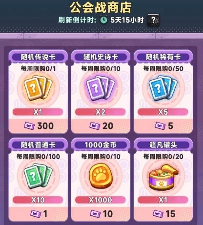 公会奖券:公会奖券可以兑换金、紫、蓝、绿卡,金币,罐头和换卡币,推荐新手每周换满1w金币(金币很重要!金币很重要!金币很重要!),其次是随机金卡,其他可以不考虑换取,同时奖券的获取公式为:每周个人获得奖券=所在公会排名*个人伤害系数排名,所以并不是去排名越高的公会越好,大家可以自行计算一下收益。