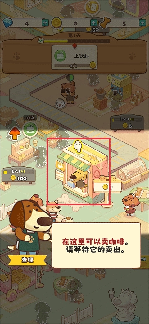 3、清洗干净的杯子会被传送至咖啡馆,等负责制作咖啡的小狗完成咖啡制作后,点击相应按钮就能将咖啡送出。