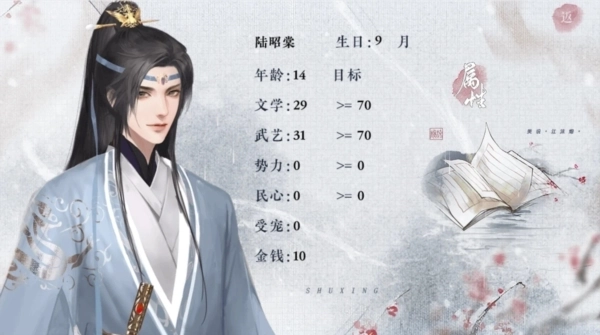 文学80,武艺78,受宠6,势力13,金钱360