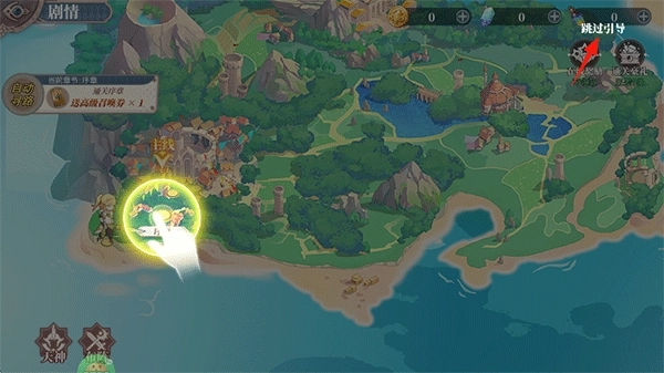 4、进入游戏后依据游戏指引点击主线,也可以点击右上角的跳过引导;