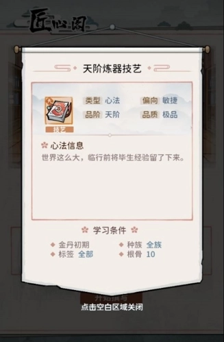 3、选择完毕将自动生成与该弟子技艺属性值相匹配的天阶技艺心法。(如:选择技艺属性值为炼器14的弟子,则自动生成天阶炼器技艺心法)