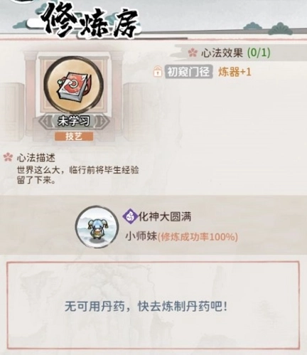 7、任意境界、根骨(根骨1及以上100%学习成功)的弟子都可以进入修炼房学习该心法。