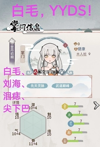 ③资质:气感影响攻击、根骨影响血防。(即便是一两点的差距,结丹后也会直接暴露无遗,所以前期六边形战士的气感和根骨必须足够优秀,通俗点说你招弟子得欧一点)