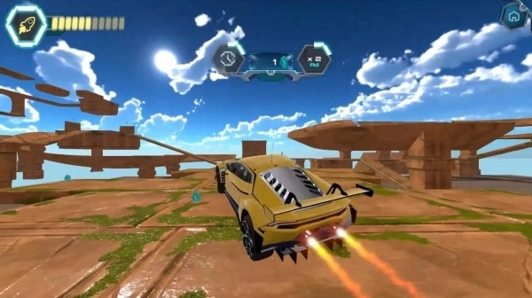 1、借助虚拟方向盘或重力感应来操控赛车,点击火箭推进按钮可达成短时加速与空中飞行,调整车身以完成翻转、旋转之类的特技动作。