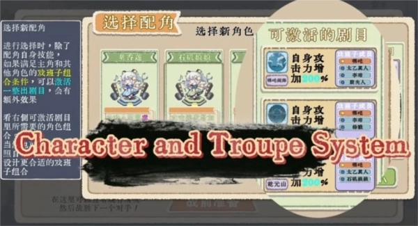 5、选择新配角,进行选择时,除了配角自身技能如果满足主角和其他角色的戏班子组合条件,可以激活一整出剧目,会有额外效果,看右侧可激活剧目里所需要的角色组合。