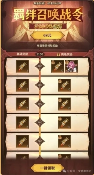 高级召唤券在前期获取非常容易,各种玩法都能获取,前7天可以免费获取500张。