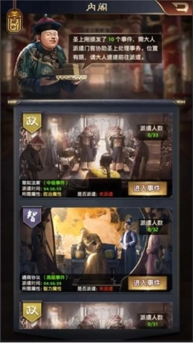 (2)内阁也是获取政绩和门客书籍经验的不二之选,跟据相应事件所需属性派遣对应属性门客参与即可。其中,参与内阁需要使用虎符进行参与(可在联盟贡献中兑换)。