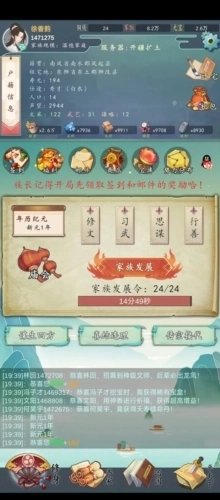 14、门客,可以招募一些门客来辅佐家族了,门客分为3类,文师、武师、谋师,各分普通、高级、神级三个等级。可给任意族人配备,在家族发展时,对应增加族人属性。还记的第一天签到给的神级文师吗,在修文界面给自己配上吧!