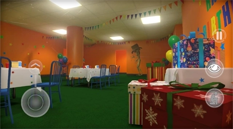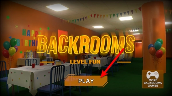 1、进入关卡,派对装饰和俏皮音乐掩盖潜伏的恐怖世界,探索扭曲的后室场景。
