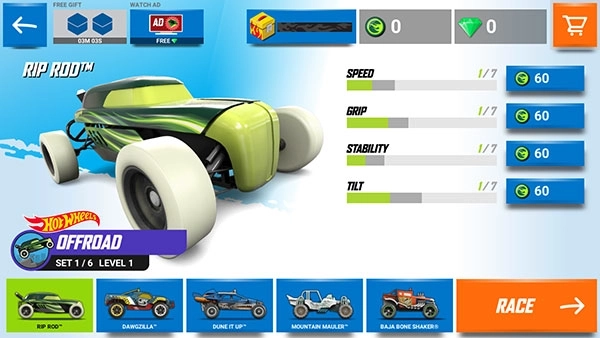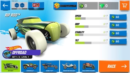 3、这个界面呈现出我们即将驾驶的赛车,点击下方的赛车图片就能进行切换,也可以在右侧对赛车进行升级,一切准备就绪后,点击右下角的【RACE】按钮即可。