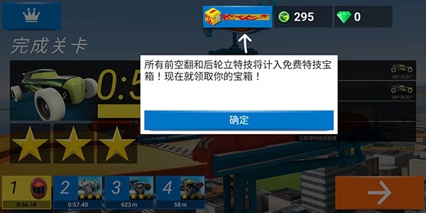 1、首先玩家需要在对局中【施展驾驶特技】,比如后轮立、前空翻这类动作,以此来积攒宝箱进度条。