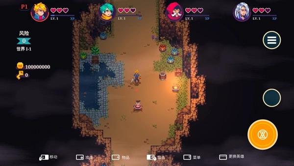 2、玩家可以随时切换所使用的角色,当某人HP不足时可以换人上来,获得加血道具也可以分给最需要的勇士,即使牺牲也没关系,可以找到复活道具重生