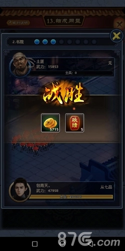 前面说了可以获得政绩外,可以获得银两,属性丸,卷轴(随机,银两固定),关卡的耗兵量和个人武力值有关,如果打关卡boss门客都用完了,boss没有打死,可以选择在商城里买出战令(复活门客)或者第二天凌晨刷新门客(免费复活),每打完一关,可以在成就里领取100元宝。