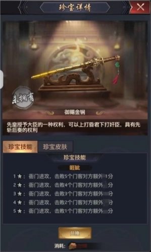 >>>尚方宝剑:珍宝技能为【锦衣】,激活技能后,装备该珍宝的门客在衙门演武战斗时,每连续击杀敌方一定数量的门客,我方将额外增加分数。