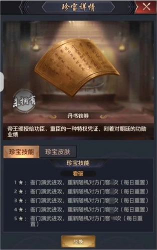 >>>丹书铁券:珍宝技能为【看破】,激活技能后,任意门客衙门演武战斗时,都可以重新随机敌方门客。