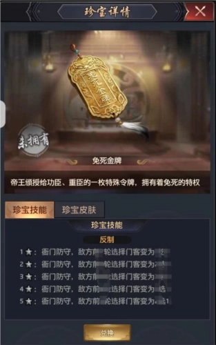 >>>免死金牌:珍宝技能为【反制】,激活技能后,当衙门被攻击时,敌方前N轮选择挑战的门客将由3选1变为2选1。