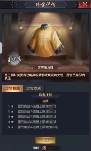 >>>赏穿黄马褂:珍宝技能为【连胜】,激活技能后,将增加盟战类战斗的连胜上限。