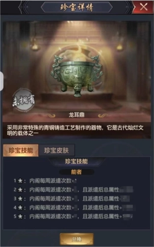 >>>龙耳鼎:珍宝技能为【能者】,激活技能后,内阁将增加每周派遣次数,且达到一定星级后,内阁派遣后总属性可获得额外增加。
