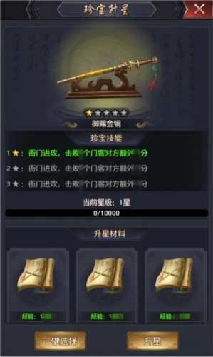 虽然珍宝初始的技能效果已经够优秀了,但还可以更优秀!大人可以对珍宝进行培养升星,提升珍宝技能的效果~珍宝星级越高,【珍宝技能】效果越强!