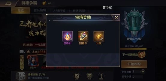 群雄争霸的比赛模式是一步步进阶的,青铜段位时,只能派遣一个队伍去挑战对手。先编组好队伍,点击开始匹配,就会匹配到相近段位的队友。