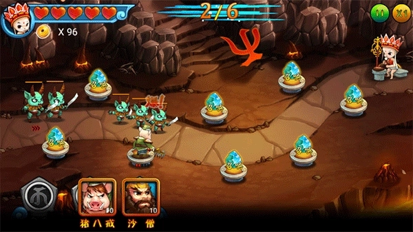 1、塔防镇守,通过建立强大的防线和策略布局,保护唐僧和真经不受僵尸侵害,挑战关卡。