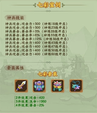 和紫色套装一样,金色套装也分为输出类和防御类,分别是山神套装和七彩套装,而且这两套的武器都是除了小蝴蝶和小金刚以外的最好的输出类角色和坦克类角色的缘分武器,建议获得后建议优先装备给所在阵容的主力以提升主力角色的能力。
