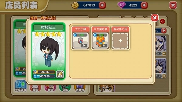 店员个人状态均可单独查看,给体力不足的店员补充体力,体力药水可以在商店购买。