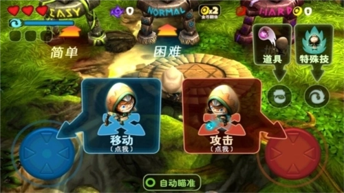 奇幻射击这款游戏的奇妙之处在于它的子弹是无限的,玩家可以在游戏开始之后就按住右下角的射击键不放,游戏可以自动对准怪物进行射击,玩家只需要左手控制方向即可。