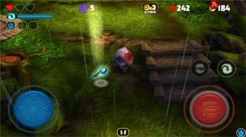 游戏操作简单,采用自动瞄准,当森林里的小怪物进入射击范畴内,就会自动对目标进行射击。游戏里有道具和怪兽可以使用,玩家集齐三个蓝色符石之后就会自动召唤一只小怪兽协助玩家战斗,玩家们要注意小怪兽的存在时间有限,可以帮助玩家解除暂时的危机。
