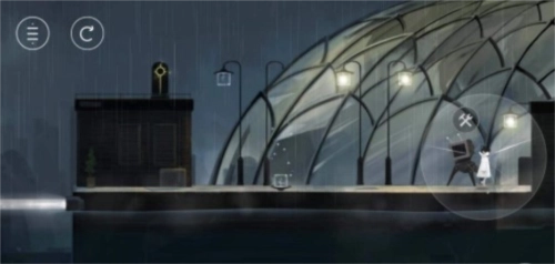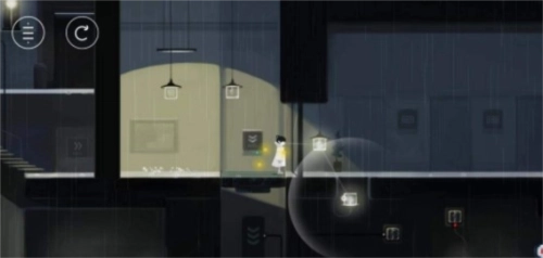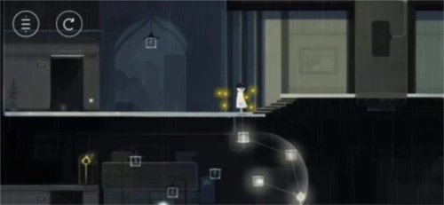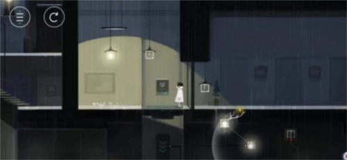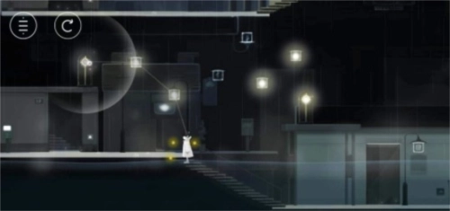 第一步:进入游戏画面,直接往右边走,用手指将前方的灯光拖到黑色灯柱处,然后去最右边吸收灯光,走到掉下来的灯柱处进入下一个场景。