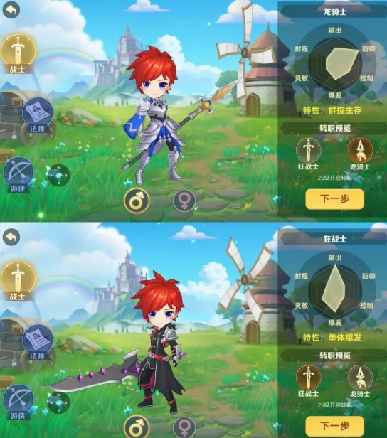 战士转职:狂战士(单体爆发)、龙骑士(群控生存)