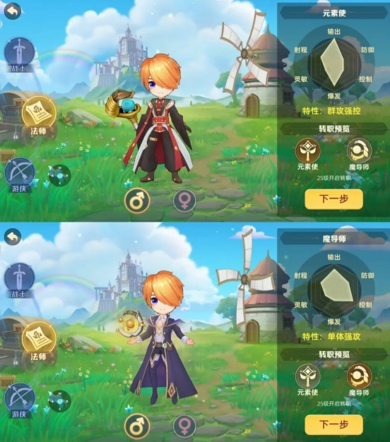 法师转职:元素使(群攻强控)、魔导师(单体强攻)
