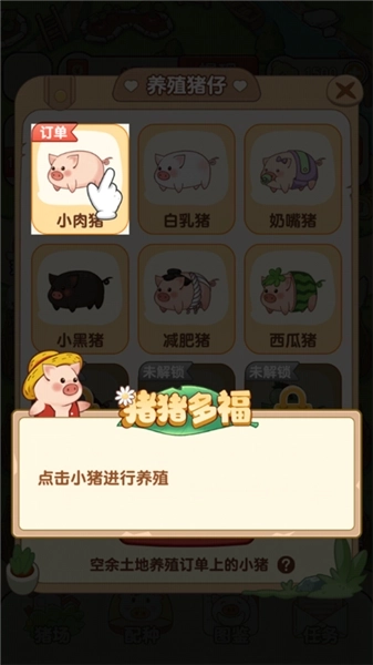 玩家可以从初始的小猪开始养殖,随着经验的积累,可以解锁更多不同品类的小猪。