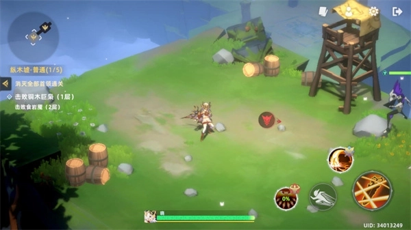 3、进入关卡后左边控制角色的移动,右边是角色的普攻、闪避和技能。