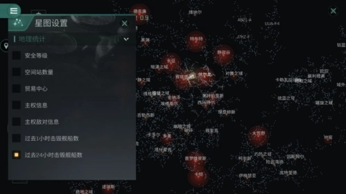 如果点击这个数字或地区名,便可以快速打开星图。而在星图中,我们既可以通过点击左下角的放大镜来搜索地区,还能点击饼状图的图标来切换星图的显示类型,查看星系的主权信息或者是PVP的危险地域。
