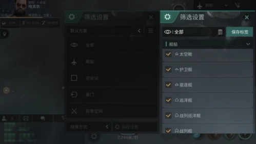 右边只有“总览”一个功能,点击眼睛图标即可打开。在这里你可以看到大部分太空中存在的物体和进入你扫描范围的其它舰船,但如果不加设置,这些乱七八糟的名称肯定会让你眼花缭乱。