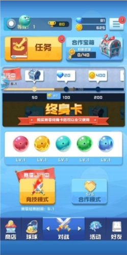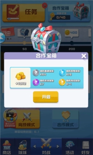 球宝每天登录,可以在【对战】-【任务】领取每日奖励,获得金币、钻石和随机的普通球球;