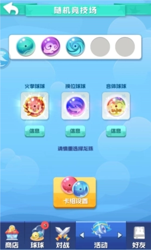 球球英雄需要在匹配之前配置好三套阵容才可以进入战斗,每种球球只能在一套阵容中使用,不能重复出现。进入战斗后不可再调整各个阵容。(已选择的球球图标将会变灰,不可再选)