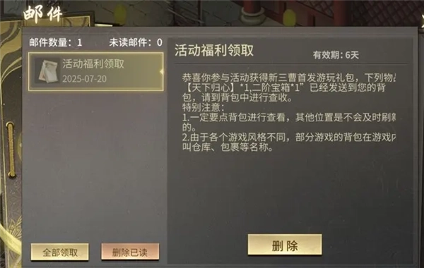 领取后的礼包会保存在活动-礼包储存中,在该界面点击领取即可加入到您的背包中。