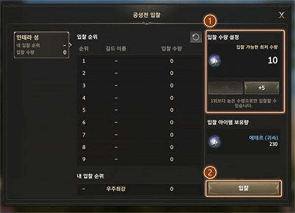 -您可以根据捐赠的'ether'排名为每个服务器排名第9位参加围攻(Suseong公会自动参加,无需竞价)。