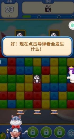3、根据指引点击弹弹道具,观察其触发的消除效果。弹弹可能会弹射消除多个方块,利用这一效果,消除熊猫周围及下方的方块。