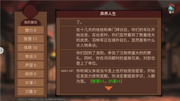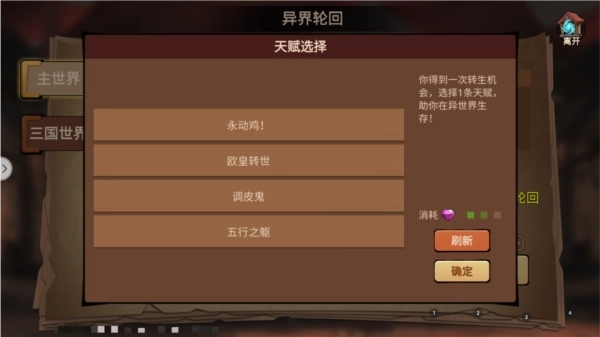 每一次的轮回,领主大人都只有一次生命,其中的每一次选择或决定都至关重要并且会影响后续的剧情发展。在主世界的剧情里,领主大人可以像个大老板一样自由选择分配自己的天赋与属性点,智慧、家境、魅力、体质任您选择,但是请注意,无论领主大人怎样分配属性,单项属性都不可以为0的。咱就是说,无论领主大人是想开局当有天资聪慧的学霸、四肢发达的猛男亦或者是选择Allin家境让自己生活很滋润的富二代,全都看领主的心情。