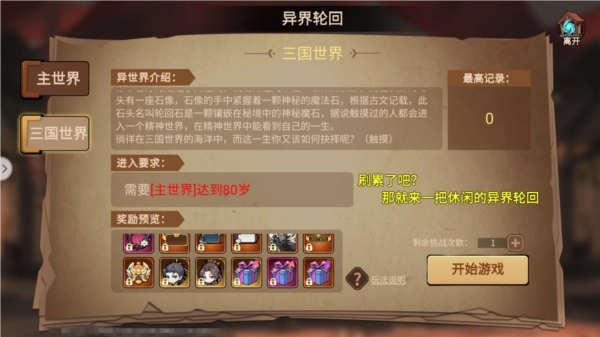 当领主大人在主世界一次冒险中历练到80岁后,还将会开启另一位面——“三国世界”。在“三国世界”中,领主大人也将体验到不同风味的三国之旅。