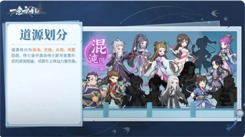 道源共分为混沌、无极、太初、鸿蒙四类,修士录中激活修士即可收集对应的道源图鉴,可提升上阵战力属性等。