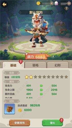 基础界面可以进行背饰的穿戴,和使用剑虎兽皮来强化背饰等级,从而提升背饰的基础属性。当达到一定等级时,则需要消耗祭司圣水来进行等突破。