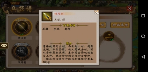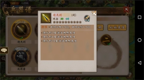 点击解锁的兵器即可以看到有关兵器的说明和其初始属性,目前一开始自动解锁的兵器只有“倚天剑”(根据游戏开始选择的武将不同自动解锁的神器也不同,曹操-倚天剑,刘备-雌雄双股剑,孙坚-古锭刀),所以我们这里就拿最简单的“倚天剑”来举例吧!
